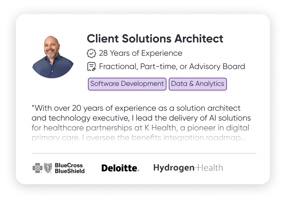 Venturous stands out from traditional recruiting by specializing in the healthcare industry, offering access to pre-vetted, senior-level talent with deep expertise in healthcare technology and operations. Unlike general recruiting methods, which can lead to mismatched hires, Venturous ensures that candidates are not only highly skilled but also align with your company’s needs and culture. This targeted focus helps reduce hiring time and costs while delivering flexible, cost-effective leadership solutions tailored specifically for healthcare organizations.