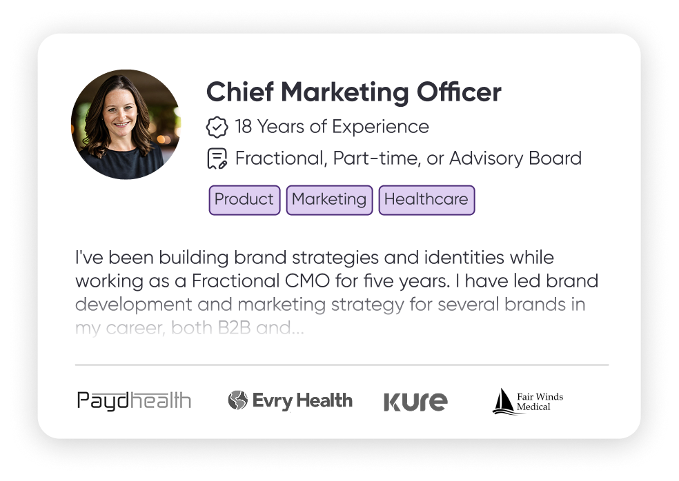 “Venturous found three fractional CMOs, each with great experience in a very niche and unique domain, which is difficult. Their efficiency and keen understanding of our company’s culture and needs made the process seamless and highly effective.